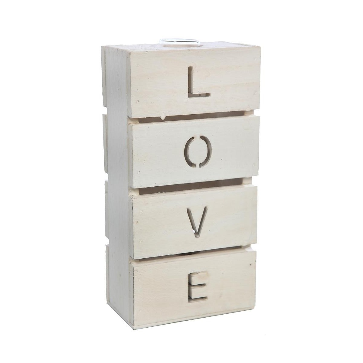 Caja de madera con una probeta para usarse como florero.