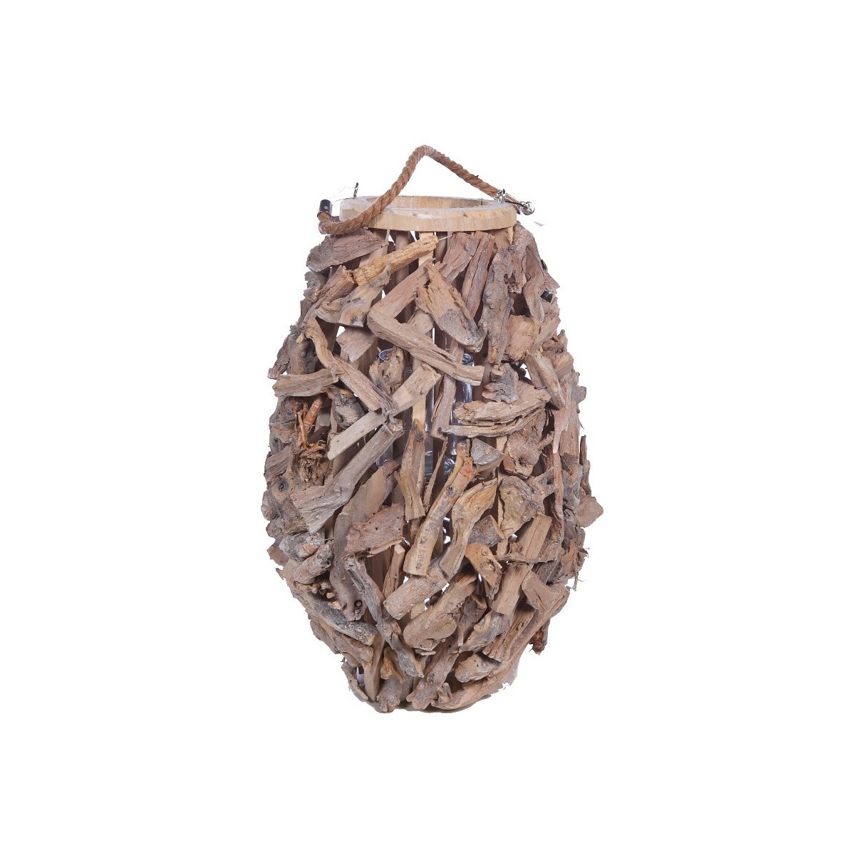 Este farol para vela ha sido fabricado con cortezas de madera, ramajes y elementos naturales. Tiene un tamaño de 53 cm de altura y hasta 30 de ancho, conteniendo un cristal de 30 cm de altura y hasta 10 de anchura.