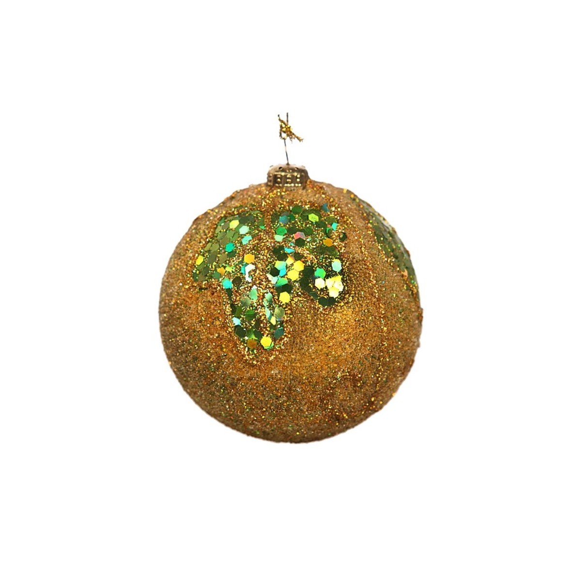 Bola de navidad dorada con lentejuelas verdes de 8 cms. de diámetro, con hilo dorado para colgar.