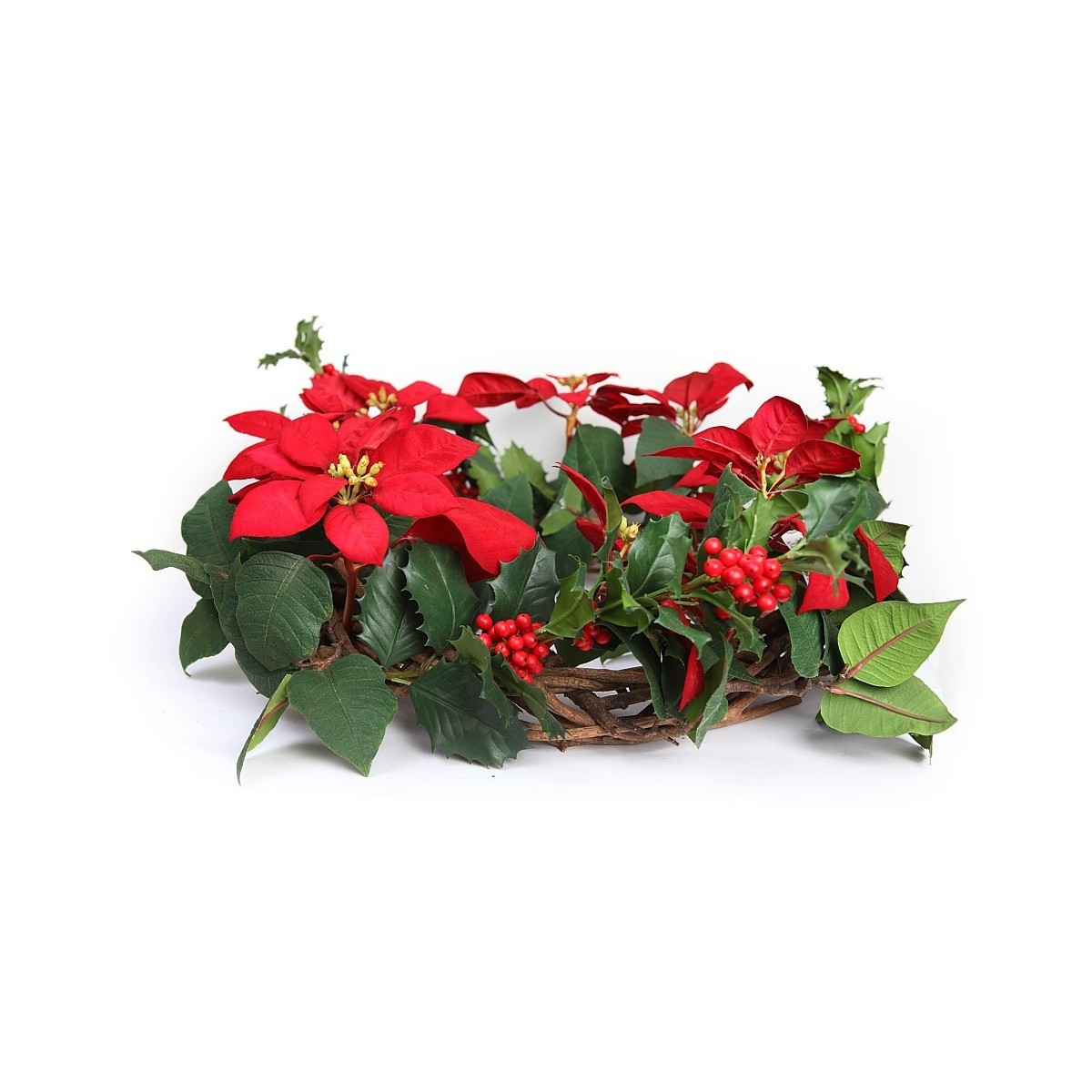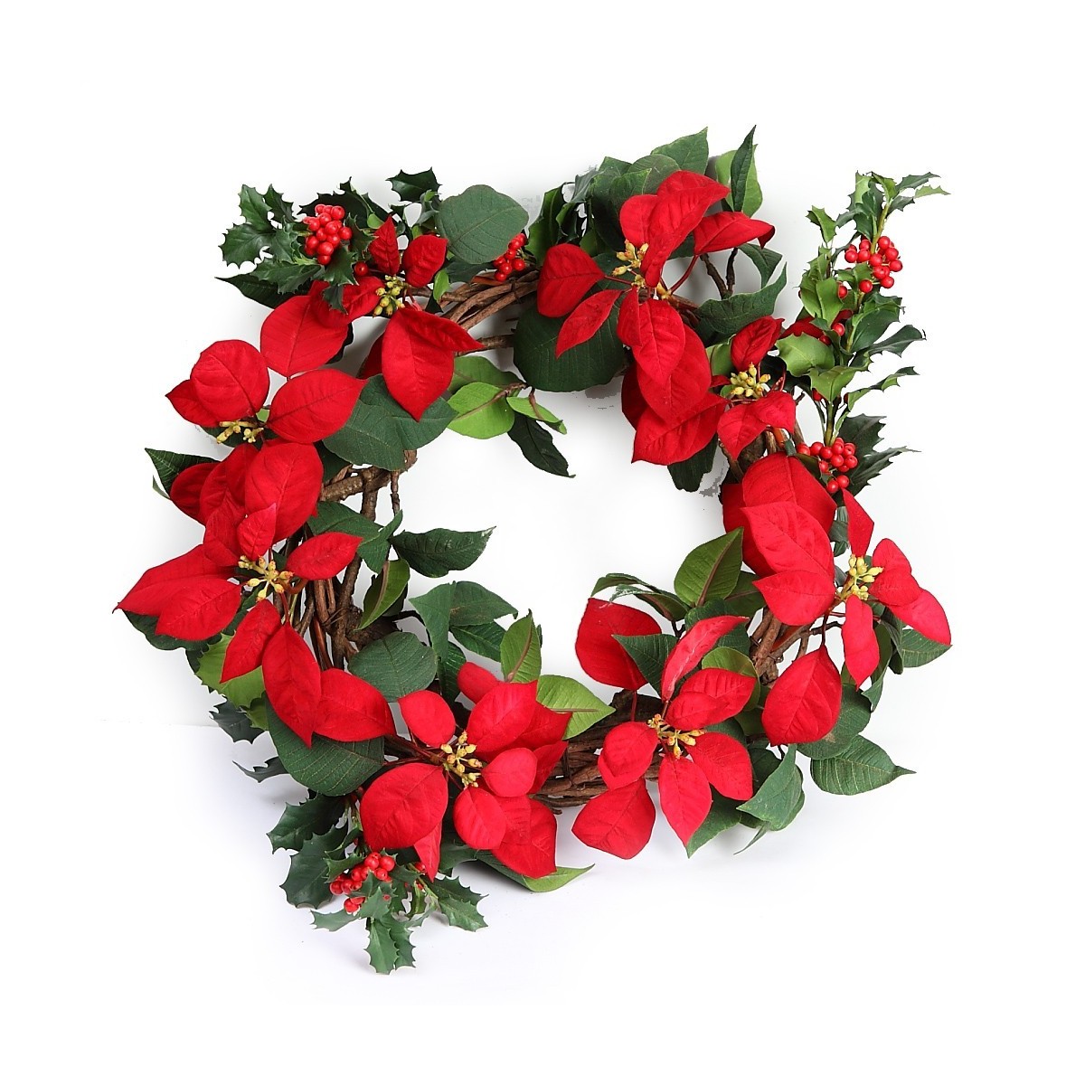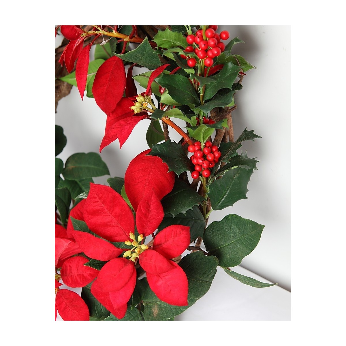 Corona ponsetia acebo de manufactura detallada, recreando naturalmente hojas y ramas.