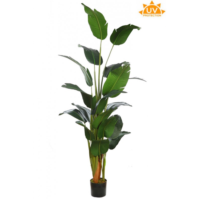 Planta artificial de Strelitzia de gran tamaño, con hojas largas y estilizadas en diferentes alturas que aportan un aspecto tropical y elegante.