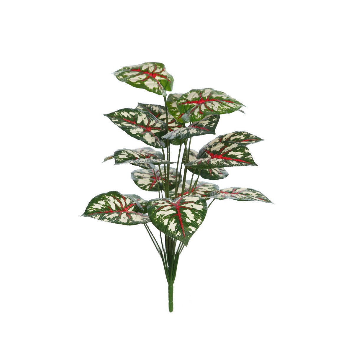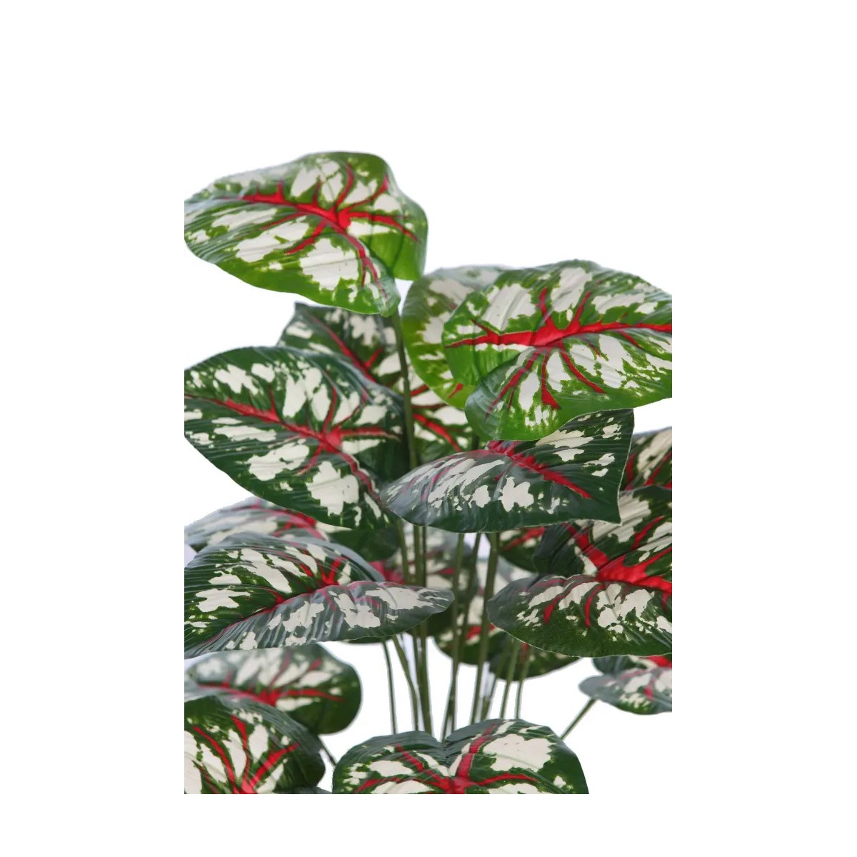 Planta artificial tipo caladium con hojas decorativas en verde, crema y acentos rojos.