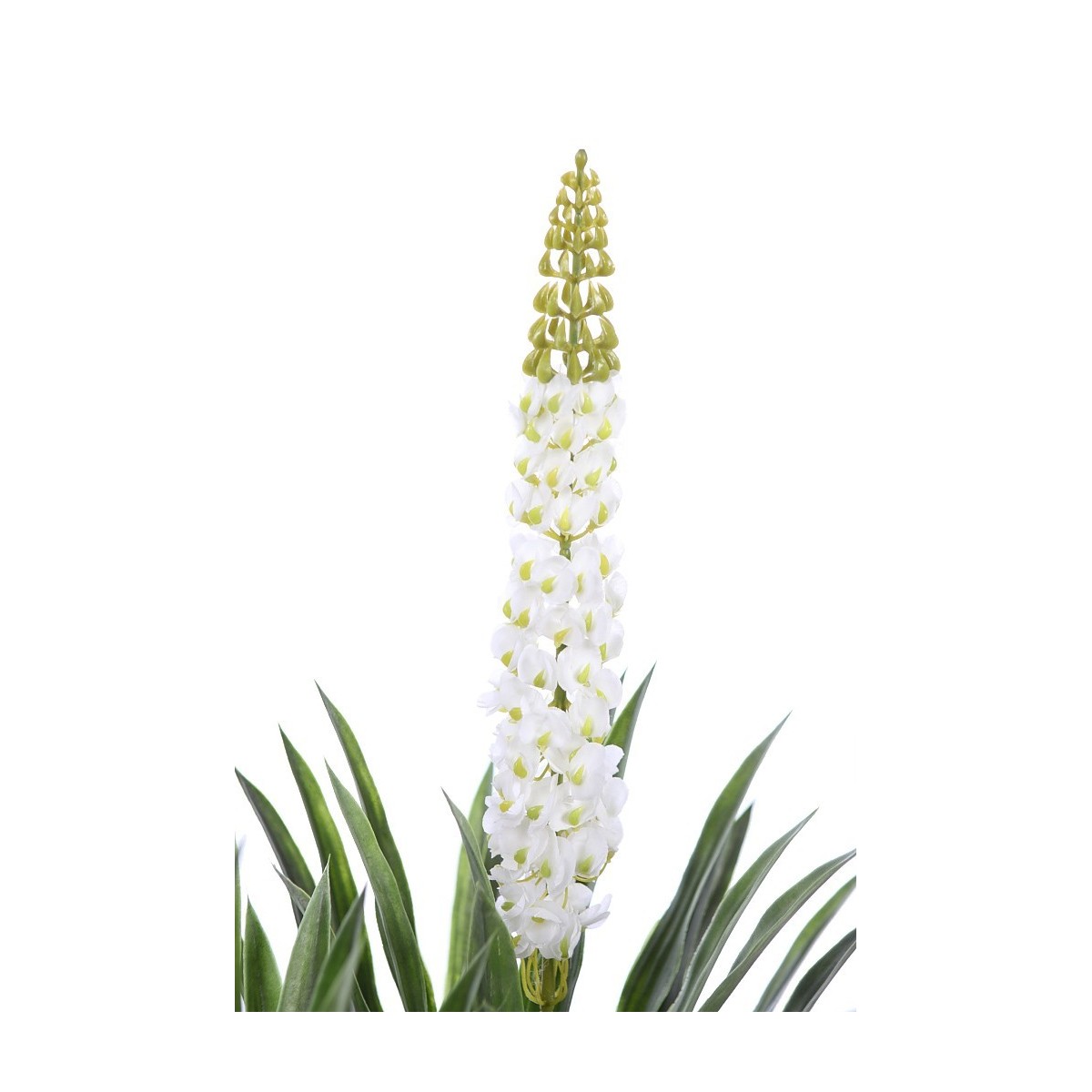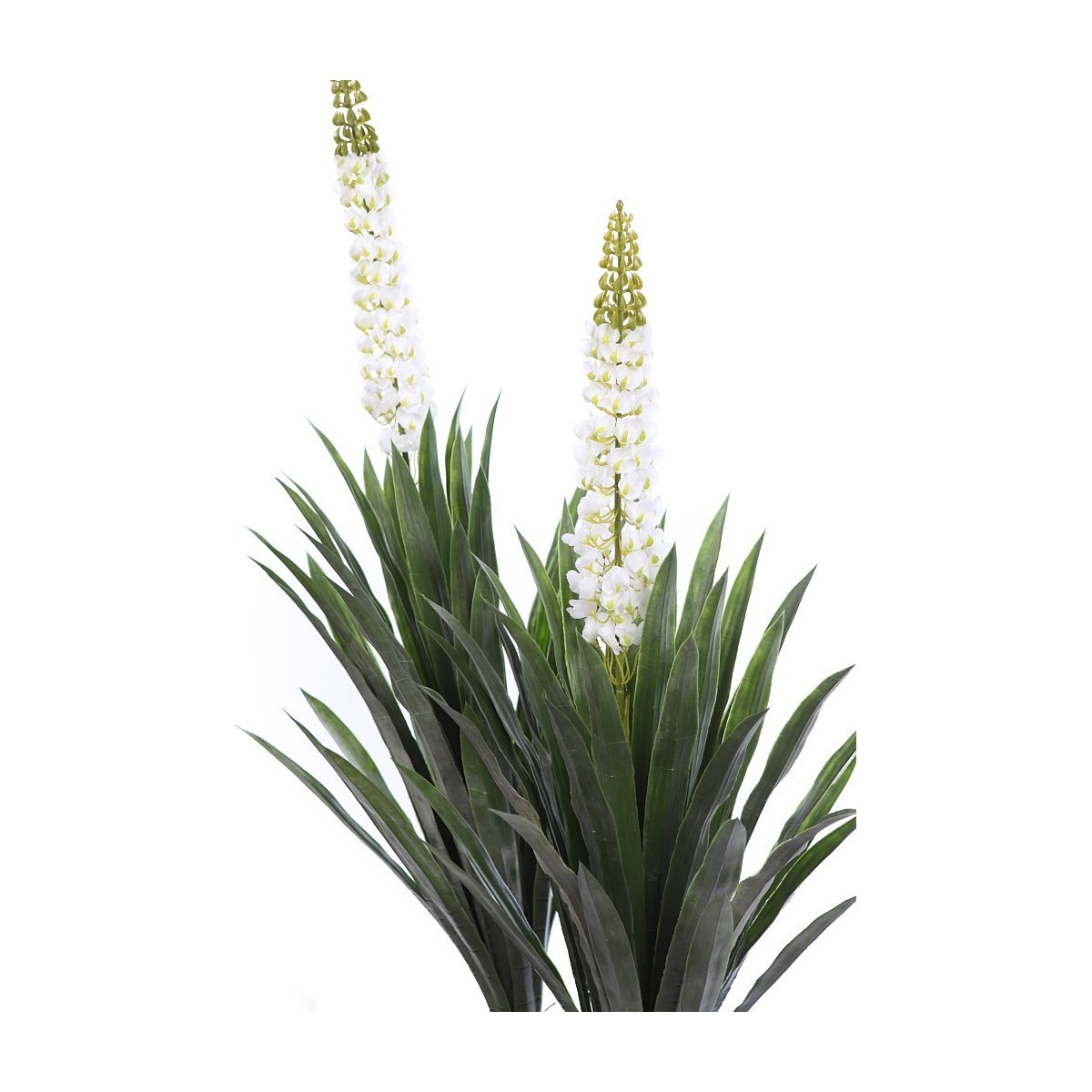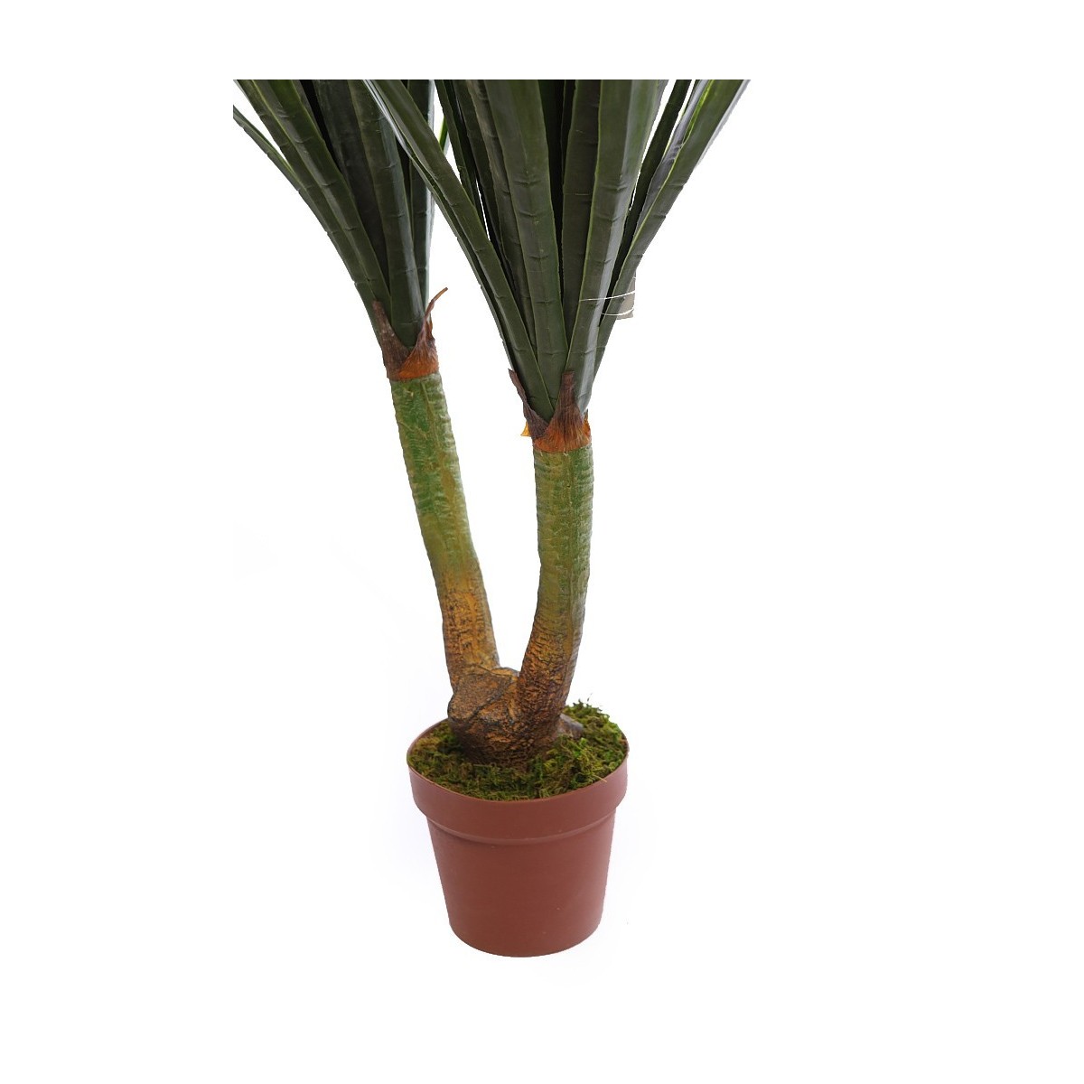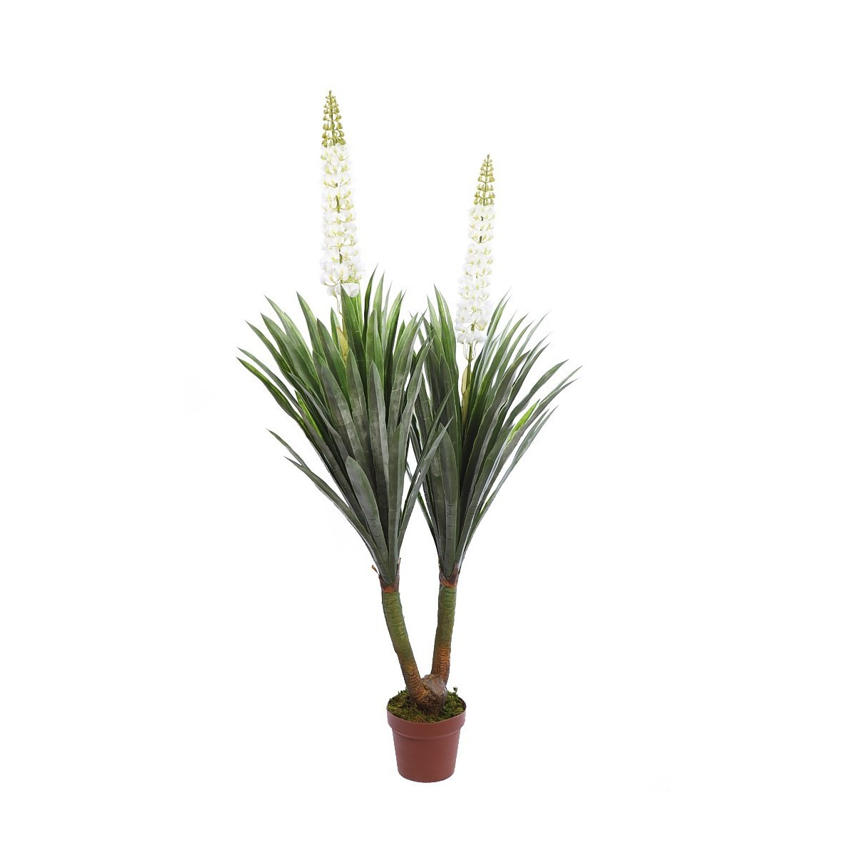 Palmera yuca artificial en maceta con tronco doble de los cuales emanan sus realistas hojas verdes, acabando la planta en un racimo de flor blanca.