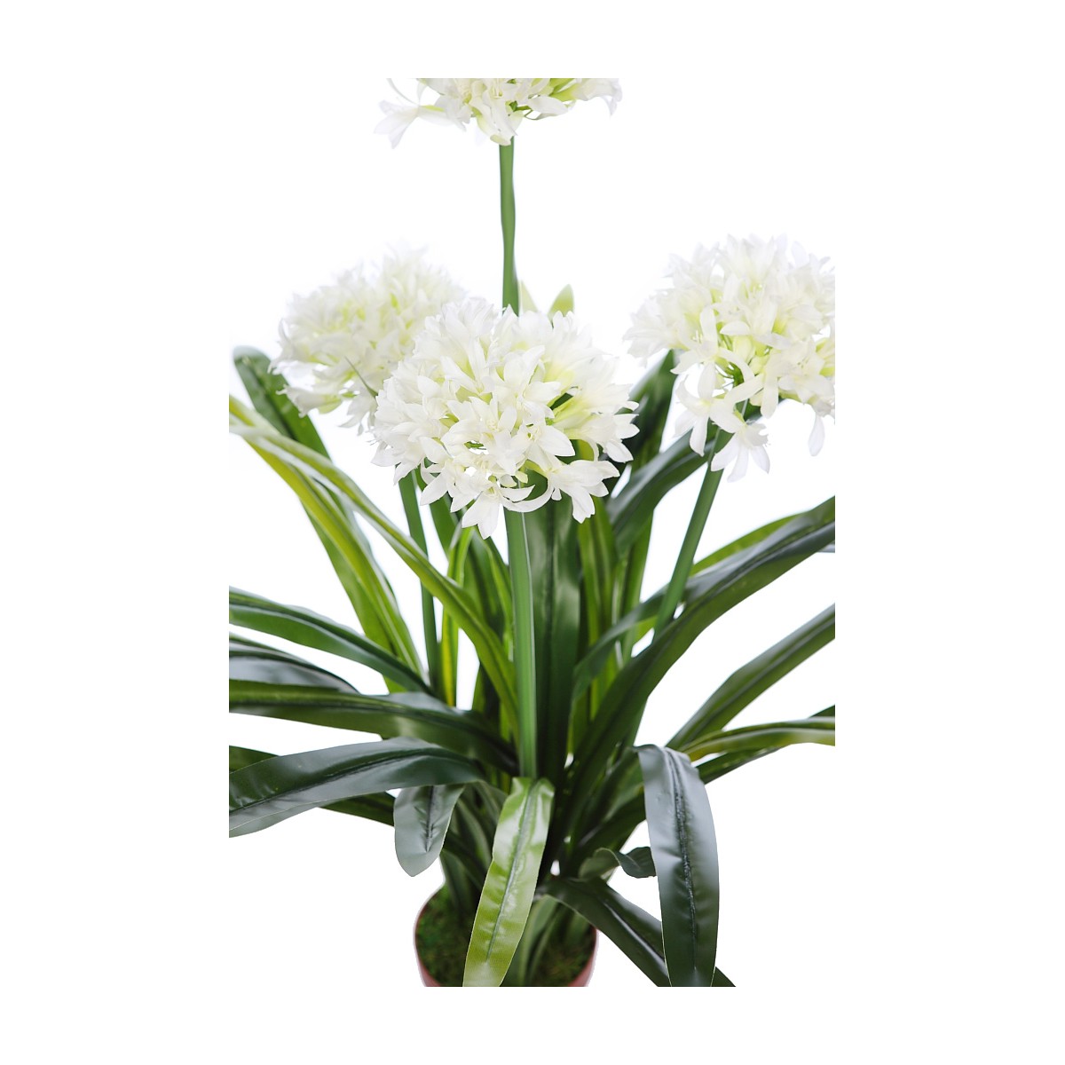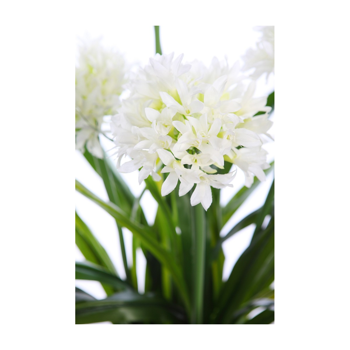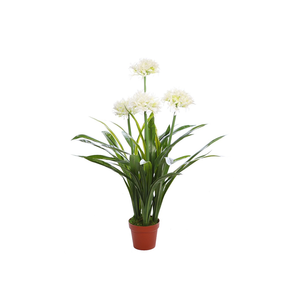 Original maceta de planta allium, con su peculiar forma de hoja y sus tonos verdes y blancos de un gran realismo, que muestran la calidad de su fabricación y la puesta en esmero de los detalles.
