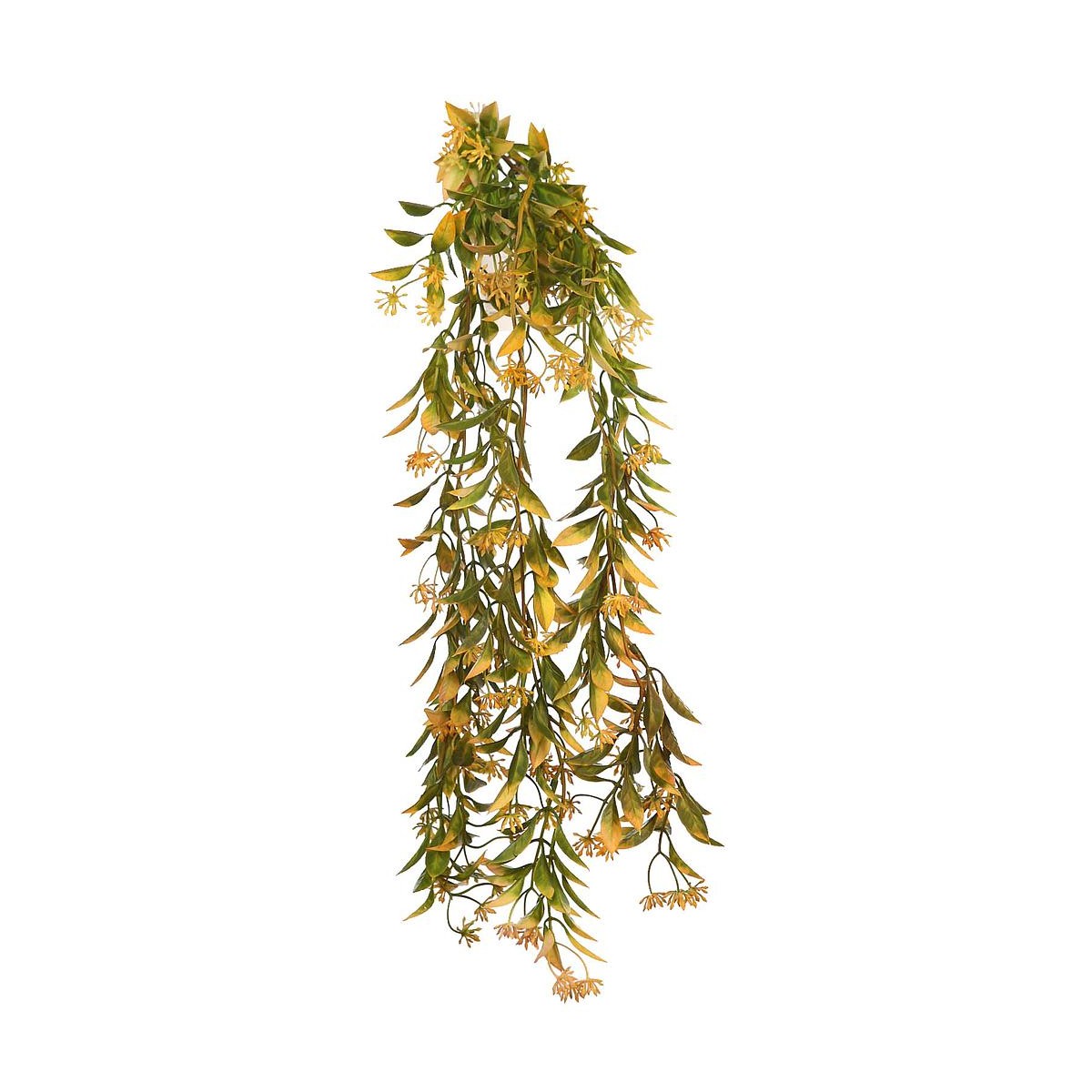 Decora con estilo natural tu hogar con esta planta colgante artificial de brotes en tonos verdes y amarillos. Su diseño realista y caída elegante la hacen ideal para interiores con un toque rústico o bohemio. No necesita riego ni cuidados, perfecta para estanterías, paredes o macetas decorativas.