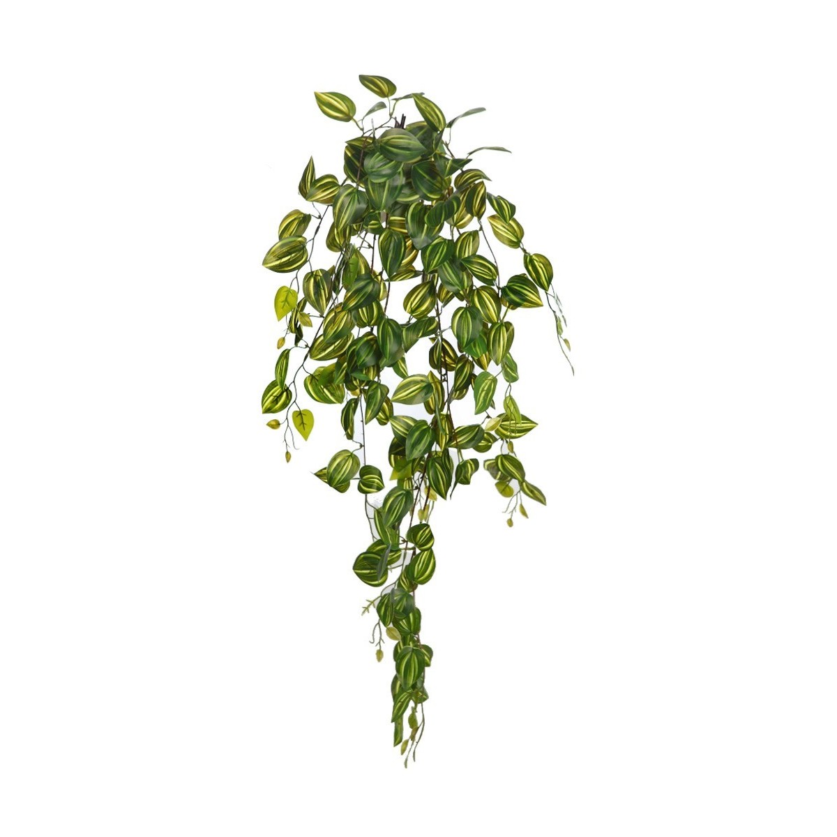 Planta colgante artificial de hojas variegadas en tonos verde y amarillo, con acabado realista y gran volumen. Ideal para decorar estanterías, maceteros altos o paredes sin necesidad de mantenimiento. Aporta frescura y un toque natural a cualquier espacio interior o exterior cubierto.