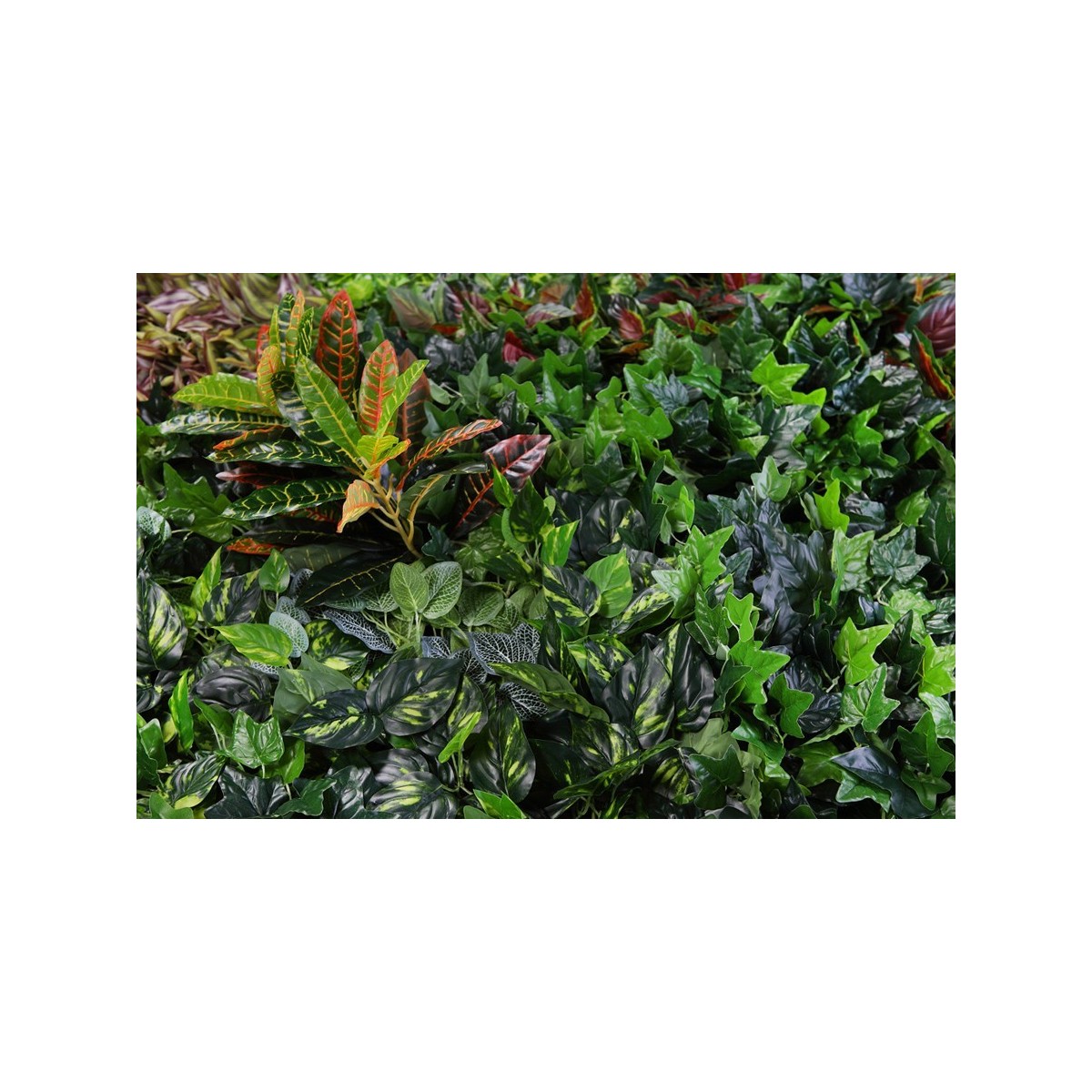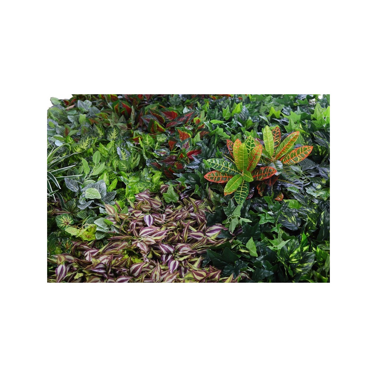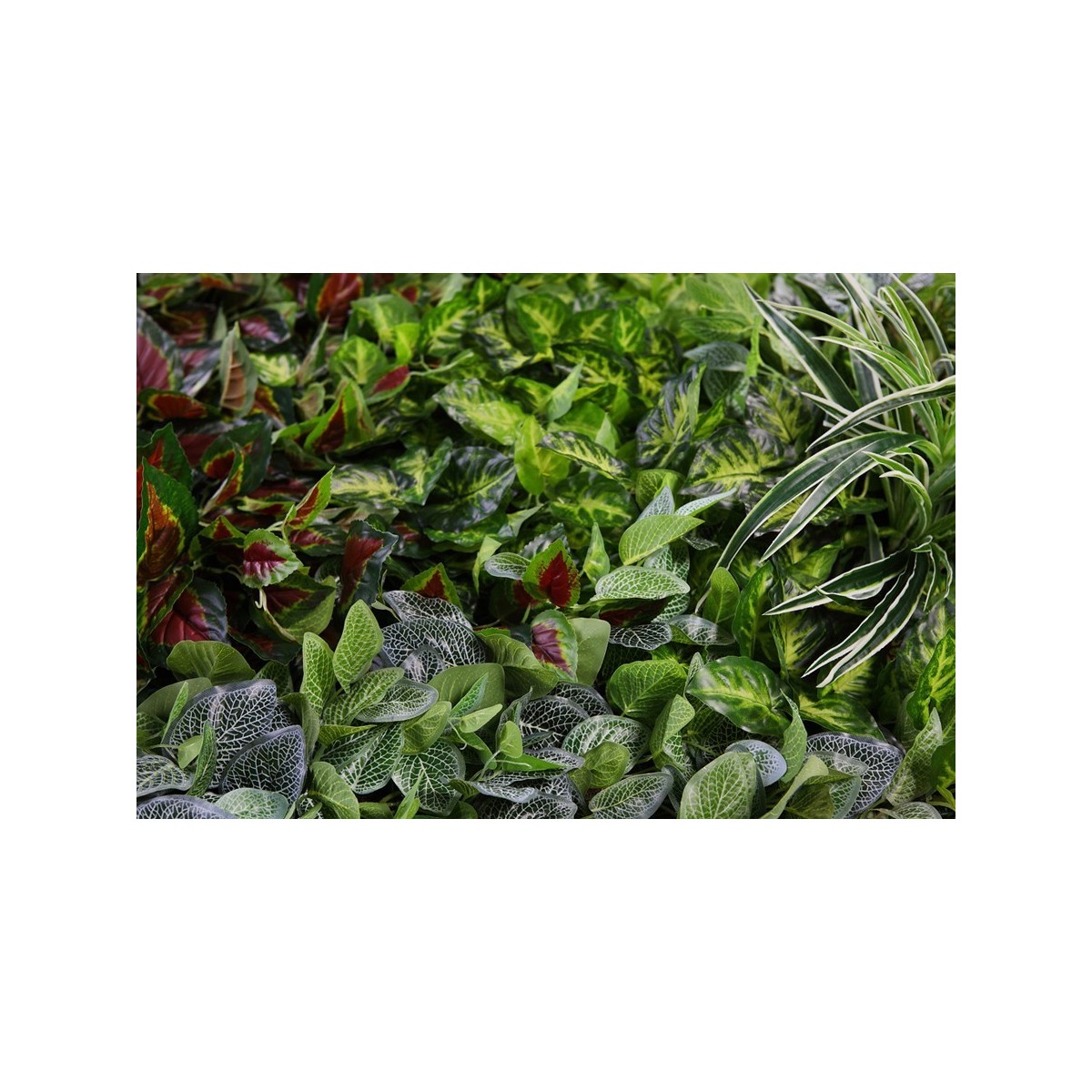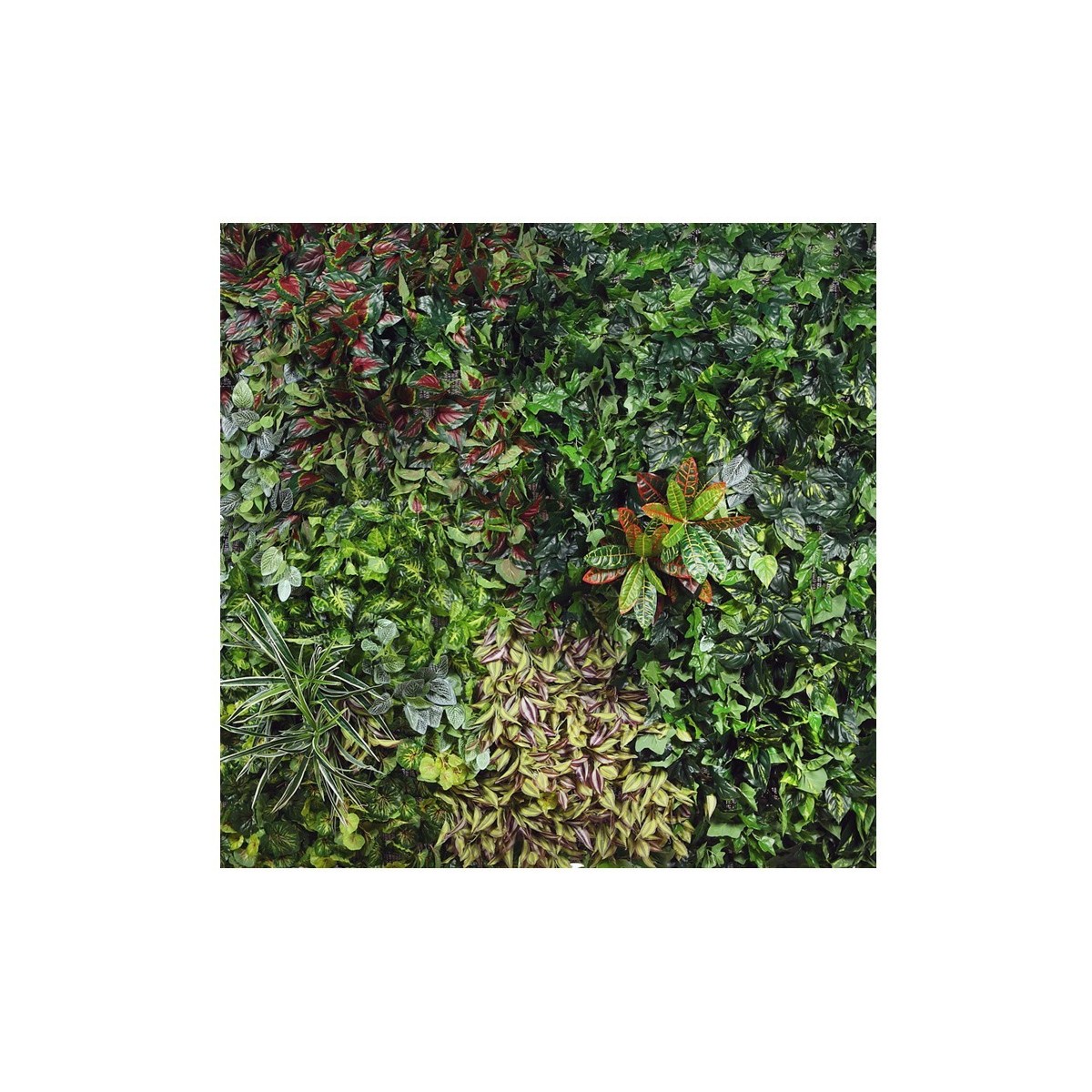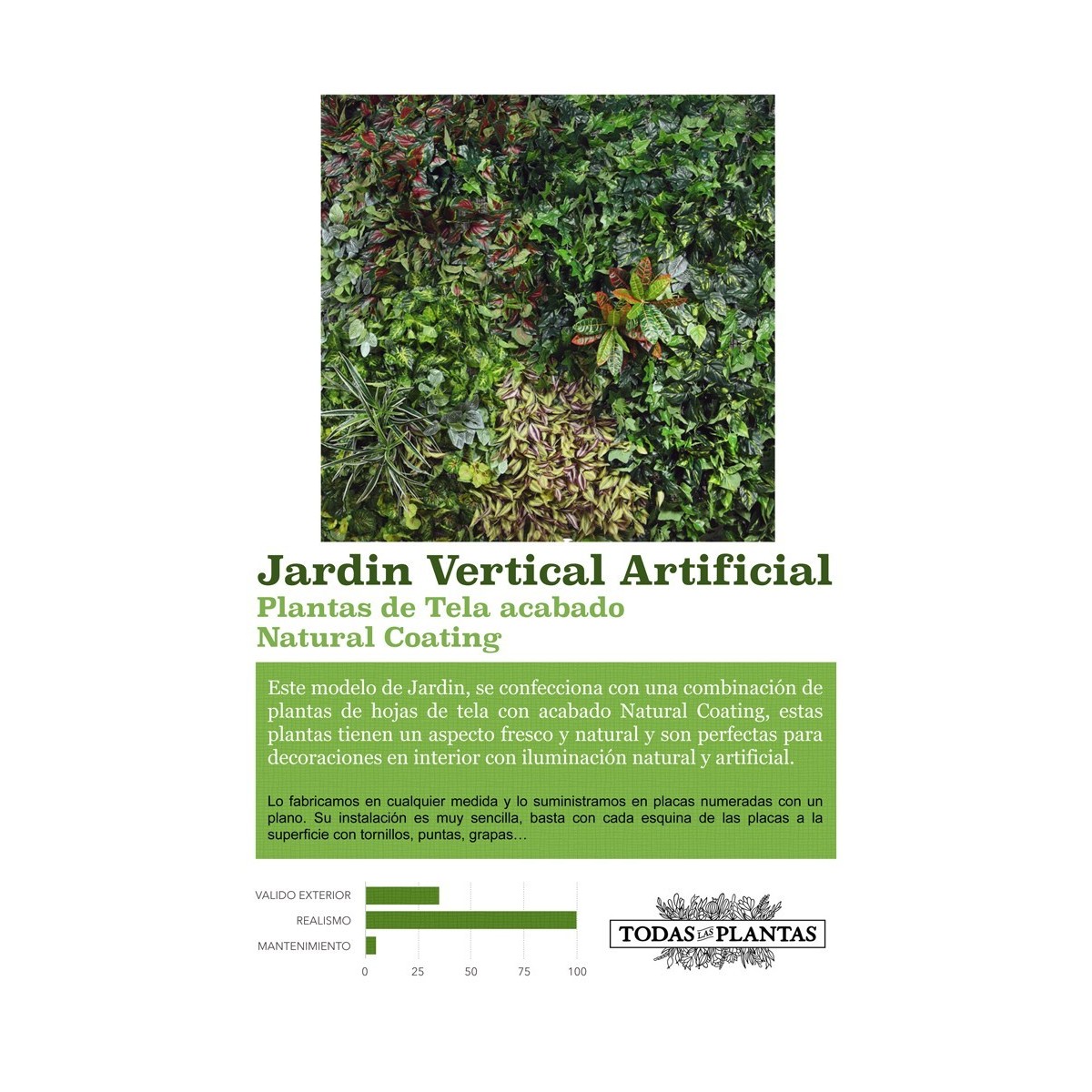 Este modelo de Jardín Vertical Artificial, se confecciona con una combinación de plantas de hojas de tela con acabado Natural Coating.