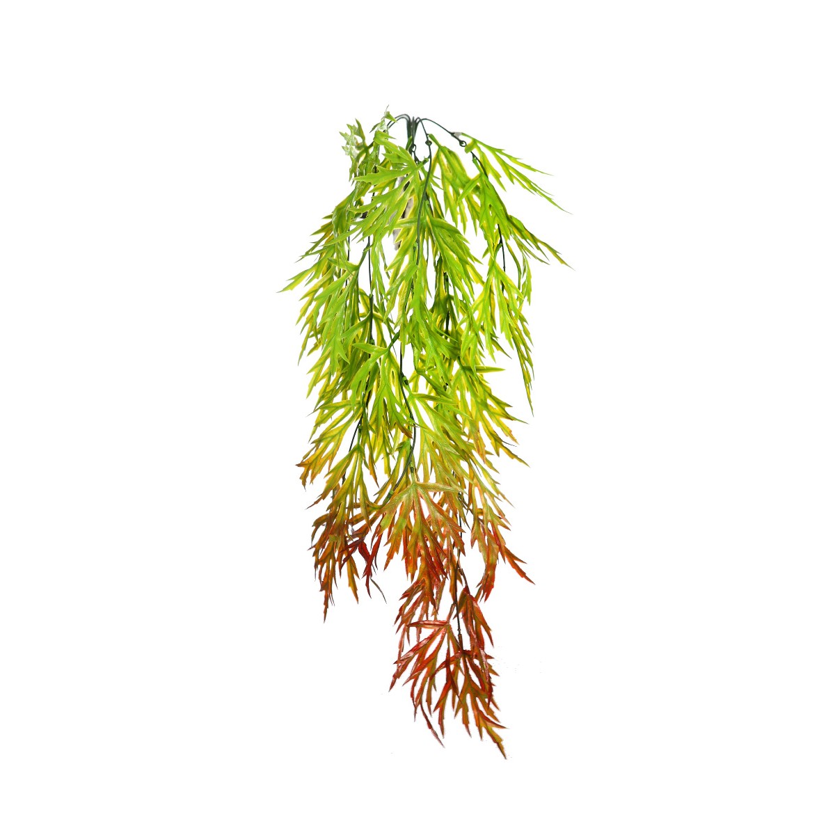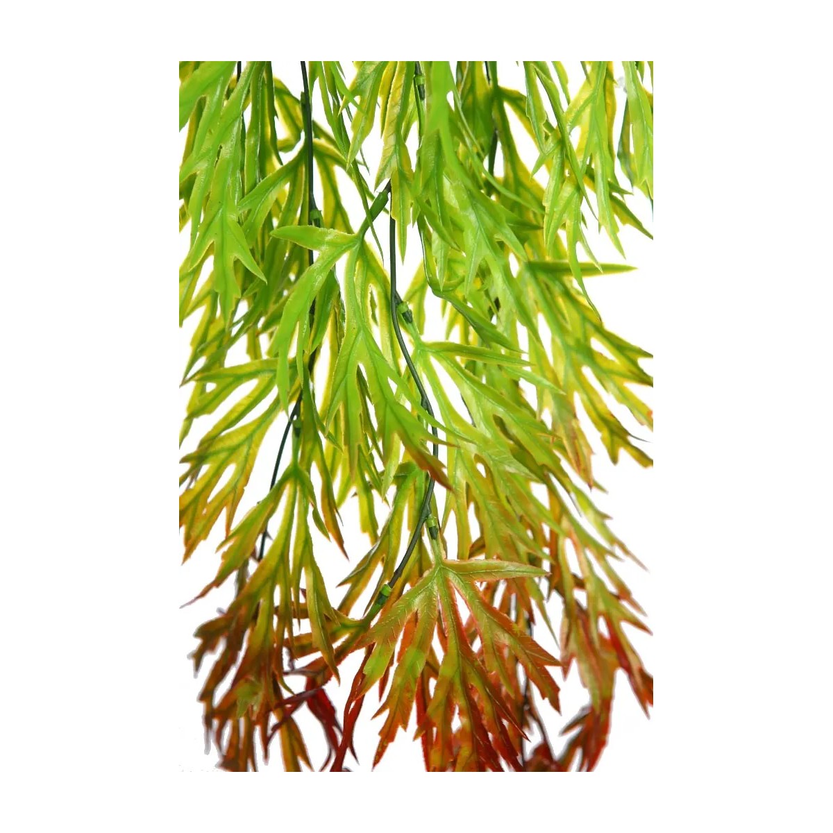 Planta artificial colgante con hojas finas y alargadas en degradado de verdes a tonos rojizos, que aporta un efecto visual muy decorativo.