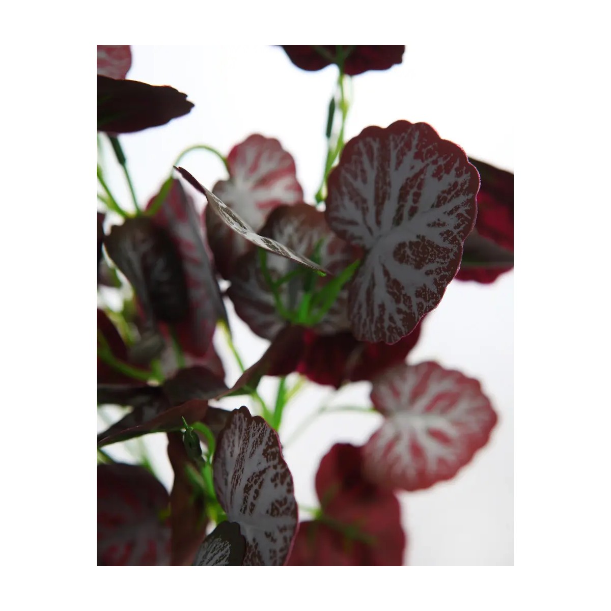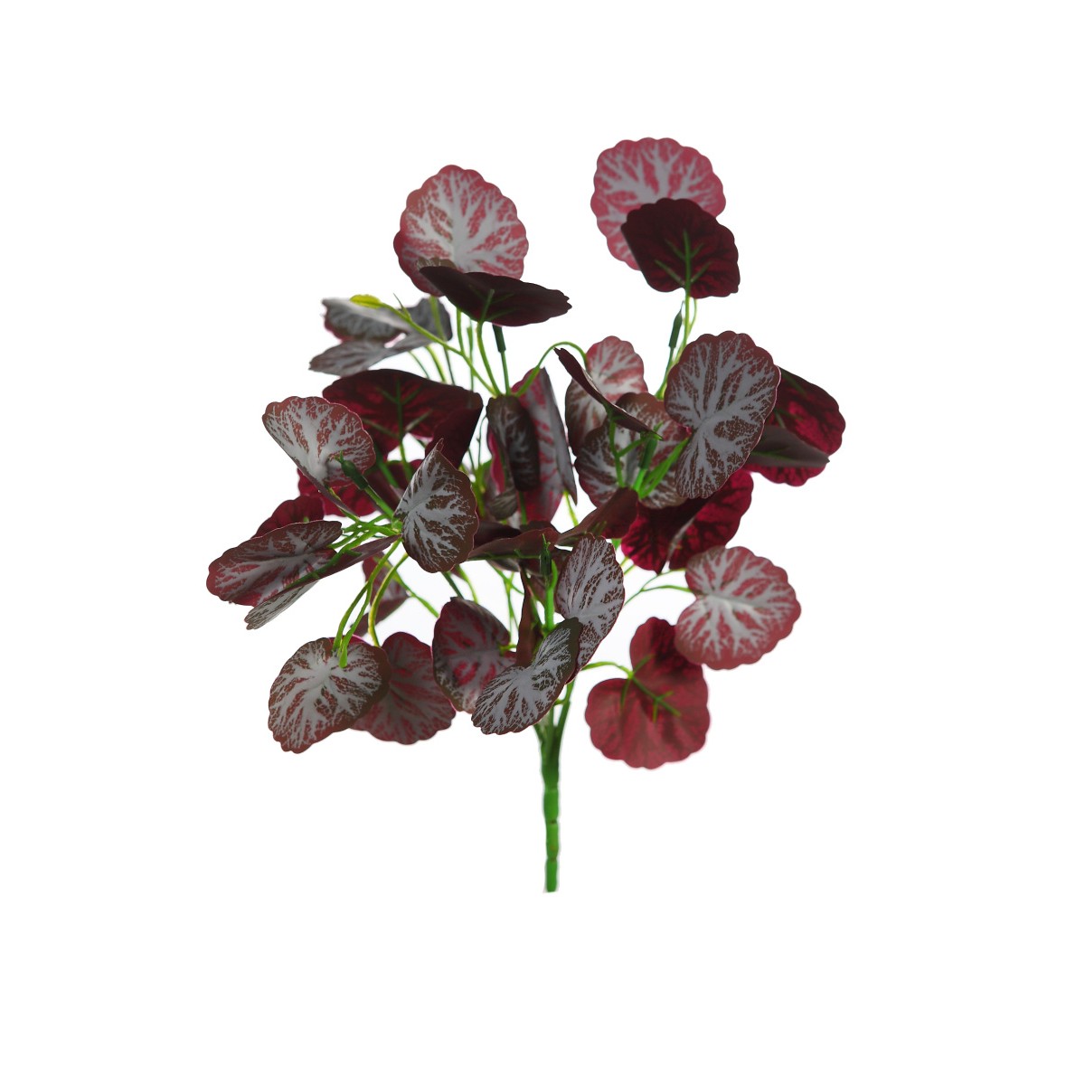 Rama artificial decorativa con hojas redondeadas en tonos rojizos y blancos, que aportan un contraste elegante y llamativo.