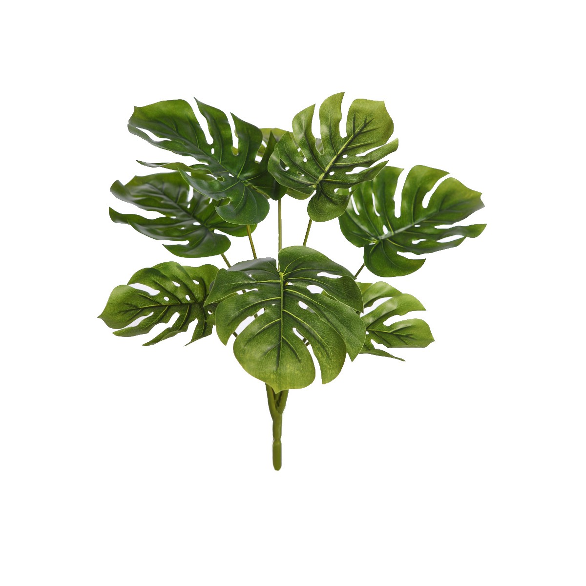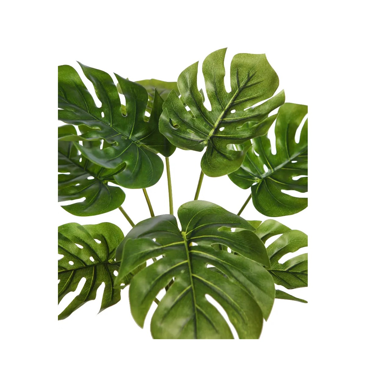 Planta artificial tipo monstera con hojas grandes y recortadas que aportan un estilo tropical y moderno.