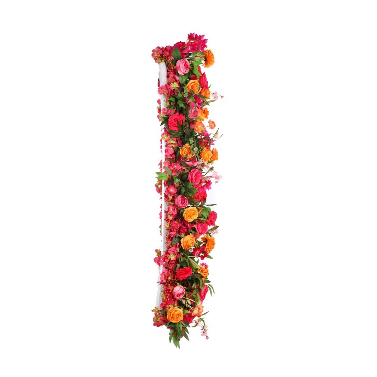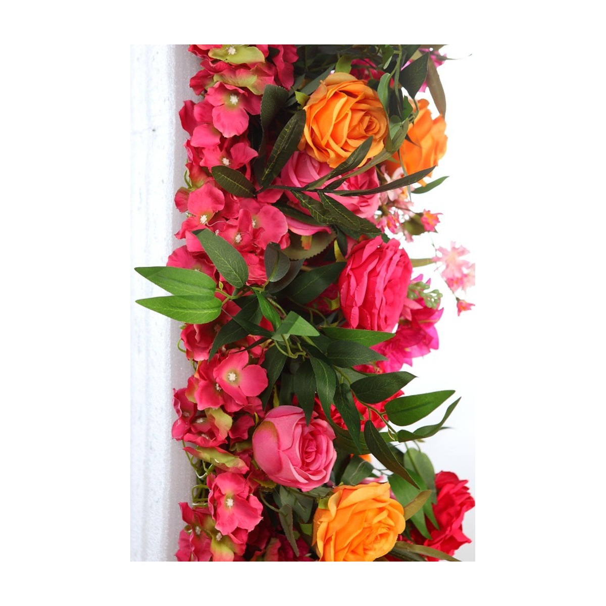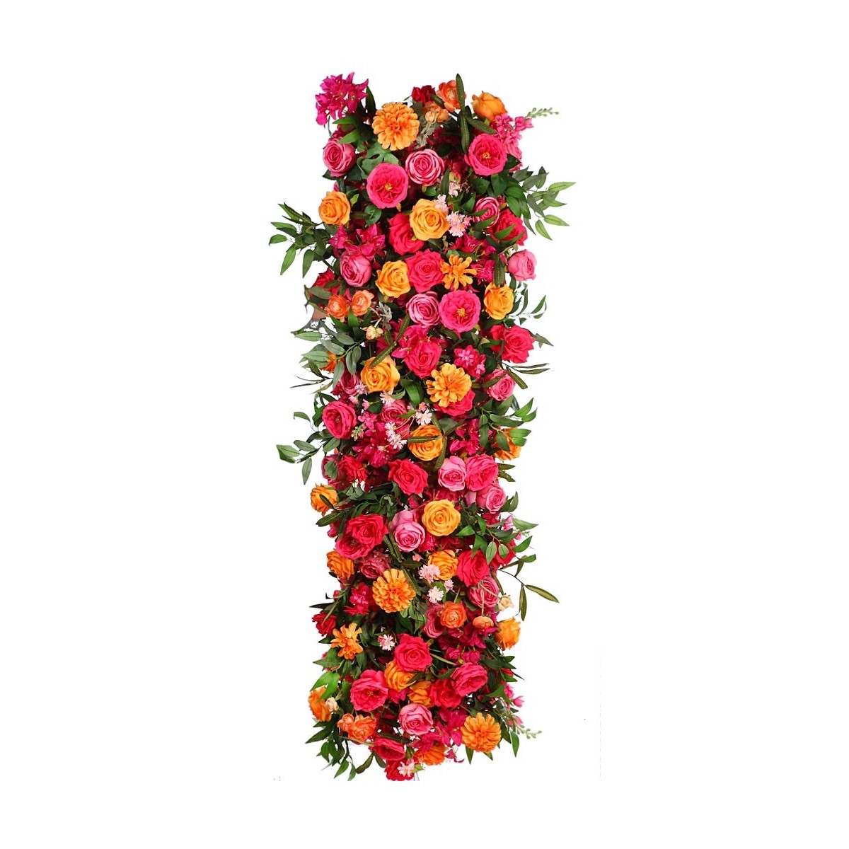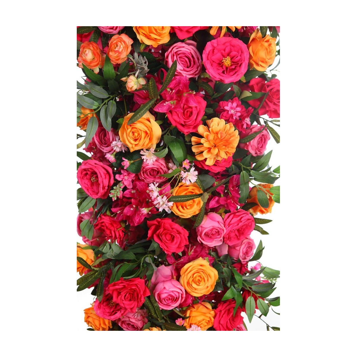 Panel decorativo artificial con rosas y dalias en tonos fucsia, naranja y coral, de aspecto vibrante y realista. Ideal para crear muros florales, escaparates o rincones especiales en eventos y celebraciones. Aporta color, frescura y un toque elegante sin necesidad de mantenimiento.